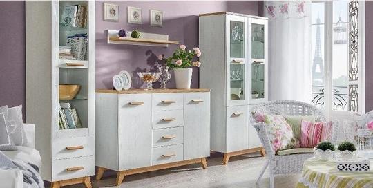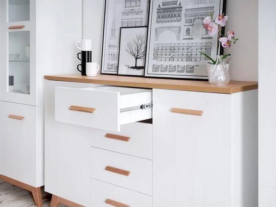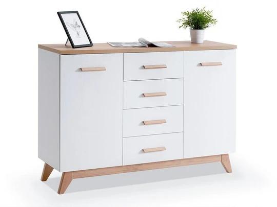 Komoda má čtyři šuplíky a dvoje dvířka s jednou policí na každé straně. Je vyrobená z kvalitní laminované desky LTD, díky kterému je odolná vůči poškrábání, oděrům, blednutí a krátkodobému působení vody. Je opatřené také hranou ABS, která zabraňuje možnému poškození. Vysoké nožky skříně a úchytky jsou vyrobeny z masivního dřeva.