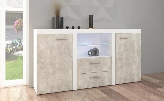 Vytříbená elegance a moderní styl. To je praktická komoda RUMBA, která svým designem dokonale obohatí váš interiér. Je vhodná do obývacího pokoje, ložnice i pracovny. Disponuje dvěmi skříňkami, dvěmi zásuvkami a jednou skleněnou poličkou. Pro podtrhnutí elegance můžete do komody dokoupit i LED osvětlení.