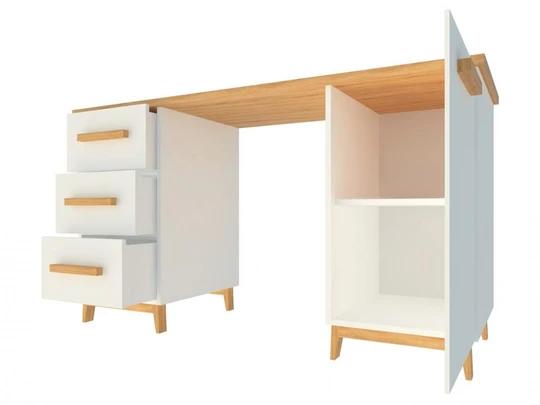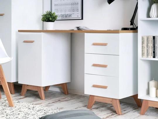 Velkorysá pracovní deska poskytuje dostatek prostoru pro notebook, monitor i dokumenty, zatímco promyšlené úložné řešení pomáhá udržet pracovní místo přehledné a organizované. Na jedné straně se nachází trojice prostorných zásuvek, ideálních pro uložení kancelářských potřeb či drobností. Druhou část tvoří uzavíratelná skříňka s policí vhodná například pro šanony, knihy nebo techniku.