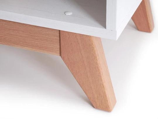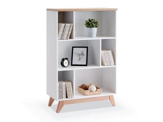 Regál má asymetrické police. Je vyroben z kvalitní laminované desky LTD, díky kterému je odolná vůči poškrábání, oděrům, blednutí a krátkodobému působení vody. Je opatřen také hranou ABS, která zabraňuje možnému poškození. Vysoké nožky regálu jsou vyrobeny z masivního dřeva.