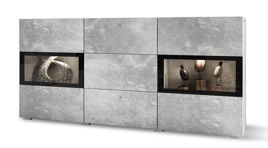 Obývací stěna v dekoru beton byla navržená v minimalistickém stylu s moderním nádechem. Už na pohled vás můžou zaujmout chybějící úchytky. Ty nahradily předsazené přední desky.