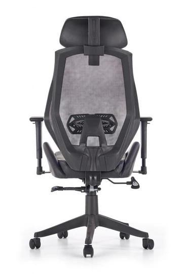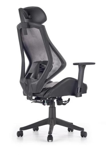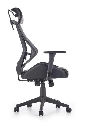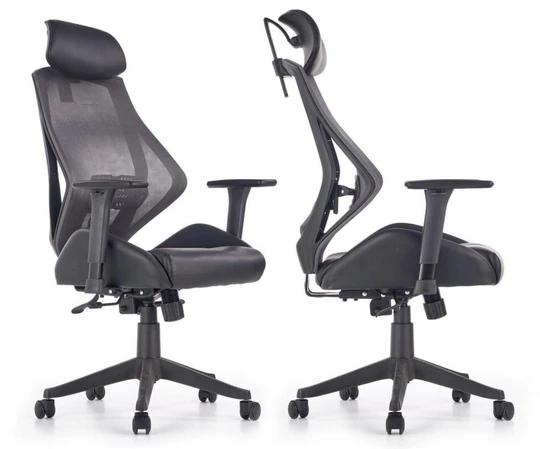 Sedací část je potažená eko kůží a vysoké opěradlo síťovinou. Součástí opěradla je čalouněná bederní opěrka a opěrka hlavy. Područky jsou výškově nastavitelné.