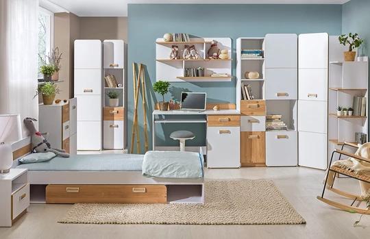Rohová šatní skříň Lorento L14 je ideální do dětského pokoje a pokoje pro teenagery. Nábytek spojuje rysy minimalistického a skandinávského stylu. Neutrální barva je vhodná jak pro holky tak i chlapce.