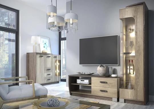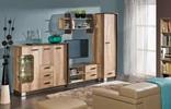 Sestava na obrázku se skládá z: R7 KOMODA (pravá strana)  + R3 TV STOLEK (levá strana) + R13 POLICE + R17 SKŘÍŇ (pravá strana)