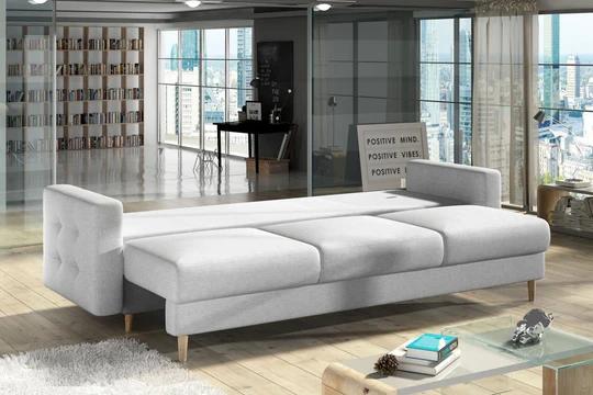 Darcy je funkčí nejen díky svým schopnostem, ale také svým všestranným designem. Ze svého repertoáru výhod nabízí rozkládací funkci a úložný prostor. Také má čalouněnou zadní stranu, proto je vhodná k umístění i do prostoru. Její součástí jsou i dva dekorační polštářky.