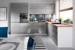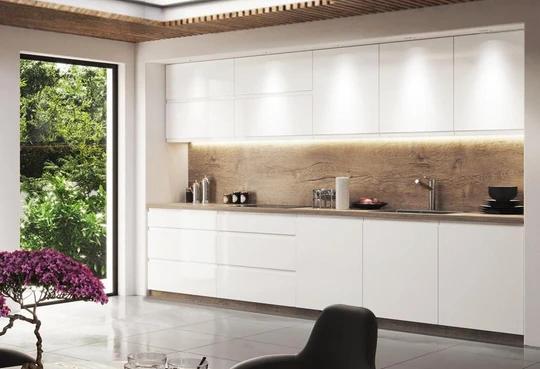 Moderní sektorová kuchyňská linka s bezúchytkovým systémem otevírání dvířek. Skříňky mají speciální frézování, díky kterému je lze normálně otevírat a zavírat.