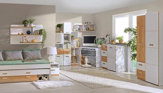 Regál je vyroben z kvalitního tvrdého lamina, které je pevné a díky tomu i velmi odolné proti mechanickému poškození (př. poškrábání). Nedochází časem ke změně barev, je odolné vůči krátkodobému působení vody a snadné na údržbu. Zaoblené hrany nábytku jsou pro maximální bezpečnost opratřeny ABS lištami, které chrání rohy proti nárazům.
