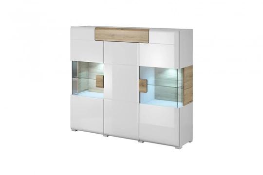 CALGARY komoda je spojením nejmodernějšího designu s přírodními prvky. Tento efekt umocňuje barevné spojení bílého lesku s dubem san remo.