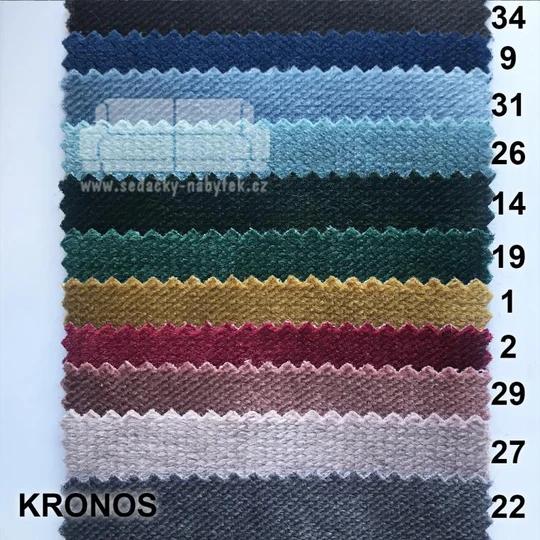 KRONOS - plyšová tkanina, jemná a měkká na dotek. Nemá tendenci žmolkovatět. V testu odolnosti Martindale 50 000 cyklů. Složením se jedná o 100% polyester.