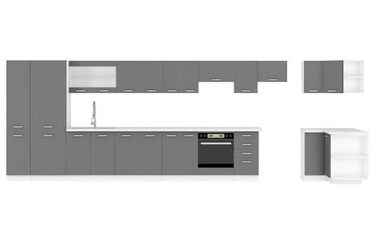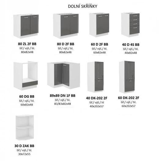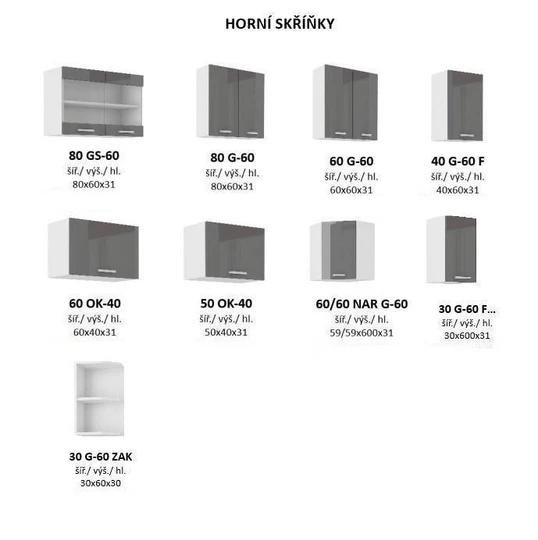 Kuchyně je vyráběna v dekoru bílý korpus a šedý lesk na dvířkách. Pracovní deska není v ceně, ale je možné jí zakoupit v dekoru bílá, hrubost 28 mm.