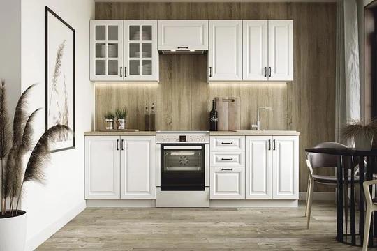 Je složena z několika druhů skříněk, díky kterým budete mít dostatek úložného prostoru na všechny kuchyňské potřeby. Se svými rozměry perfektně zapadne i do menších interiérů. Pracovní deska má hrubost 28 mm. Váha kuchyně je 123 kg.