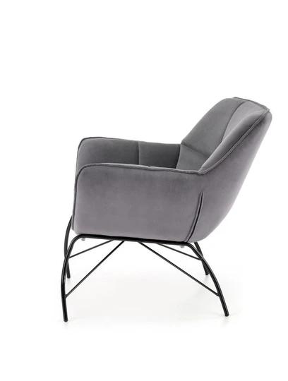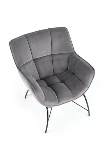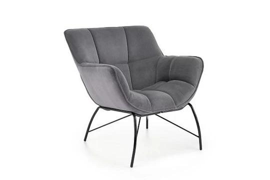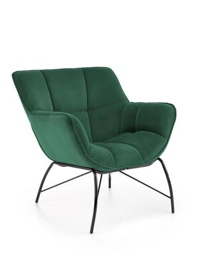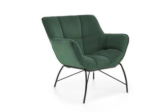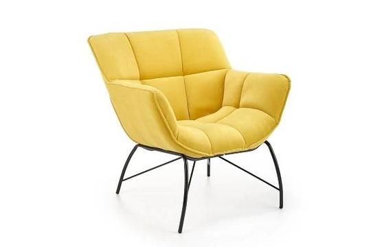 Křeslo má kovové nožky. Belton je celočalouněné a na výběr je ze 3 barevných variant a to tmavě zelená, žlutá a šedá.