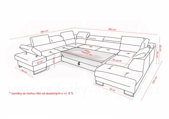 Sedačka disponuje rozkladem a i úložným prostorem o rozměrech 118x192 cm. Výhodou jsou polohovatelné opěrky hlavy a nadstandartně i polohovatelné loketní opěrka. Díky opěrkám můžete přizpůsobit komfort sezení Vašim potřebám. Šířka bočku s loketní opěrkou je 45 cm.