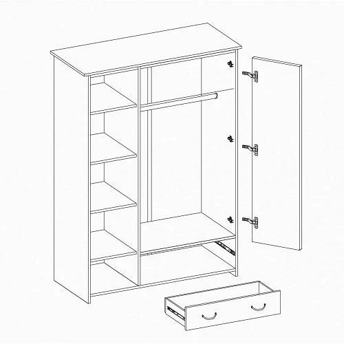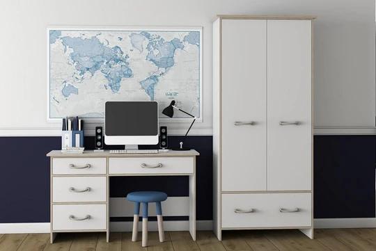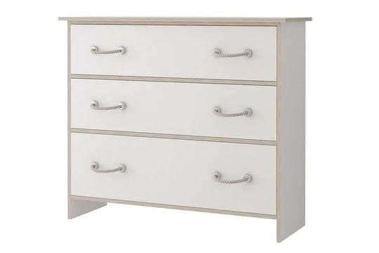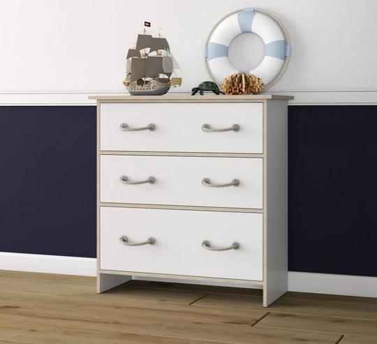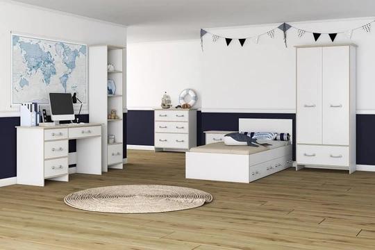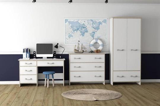 Sestava obsahuje skříně, regál a komody různých velikostí. Nechybí ani psací stůl a dokonce zde najdete i postel 90x200 cm s roštem. Nábytek je moderní, funkční a prostorný. Rukojeti jsou v designu námořnického lana