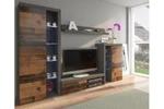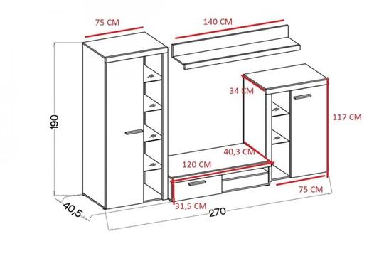 Obývací stěna se skládá z televizního stolku, dvou vitrín a  police. V případě potřeby úložného prostoru navíc lze dokoupit také příslušná komoda. Nábytek je vyrobený z kvalitního lamina, které je velmi odolné vůči mechanickému poškození (př. poškrábání), vlhkosti a nepodléhá času.