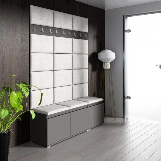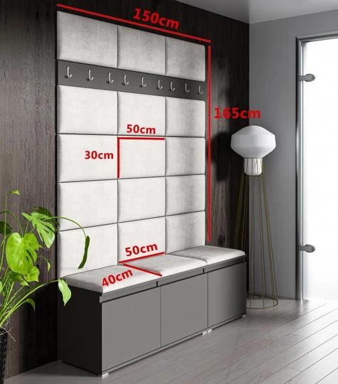 Taky to znáte? Otevřete hlavní dveře domu a na zemi se válí plno pohozených bot, tašek, sem tam i nějaké to oblečení? S tímto už je konec. S naší elegantní předsíňovou stěnou DIAMOND 6 budete mít vše krásně uloženo a navíc rozáří Vaší chodbu a dodá ji pocit útulnosti. Nábytek je vyroben z kvalitního lamina o tloušťce 1,6 cm, který je odolný proti poškrábání, vlhkosti a vysokým teplotám. Navíc je nenáročný na údržbu. Hrany jsou z PVC materiálu. Předsíňová stěna poskytuje prostor jak pro pověšení kabátů, bund či jiných oděvů, ale také i pro boty. Nejvíce oceníte ale místo k sezení, které Vám umožní snadnější obouvání. Stěna se pyšní svými moderními a hlavně i barevnými čalouněnými panely, které jsou poslední dobou velkým trendem. Jsou vyrobeny ze sametově hladké látky. Na výběr máte až několik odstínů. Sestava se skládá z botníku, věšáku a panelů.