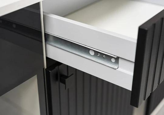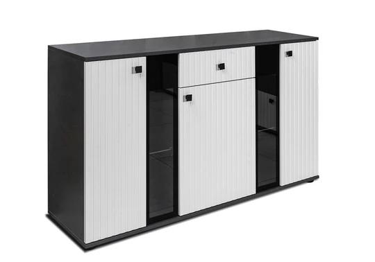 Ozdobné lamely na předních dvířkách dodávají nábytku velkolepý efekt. Okraje jsou chráněny odolným melaminem