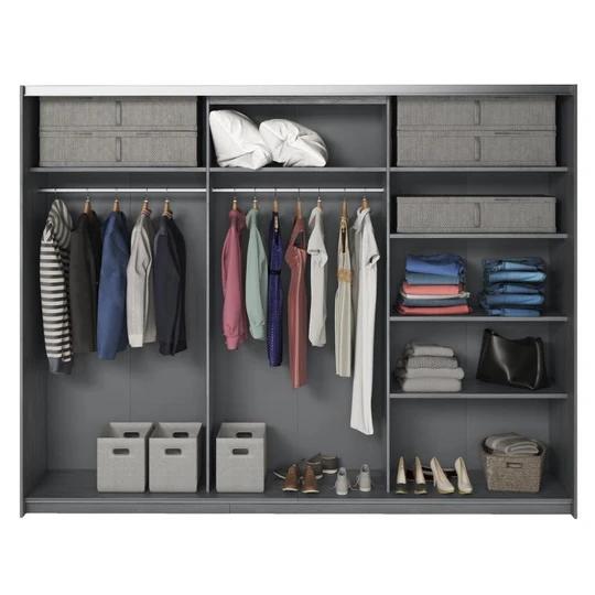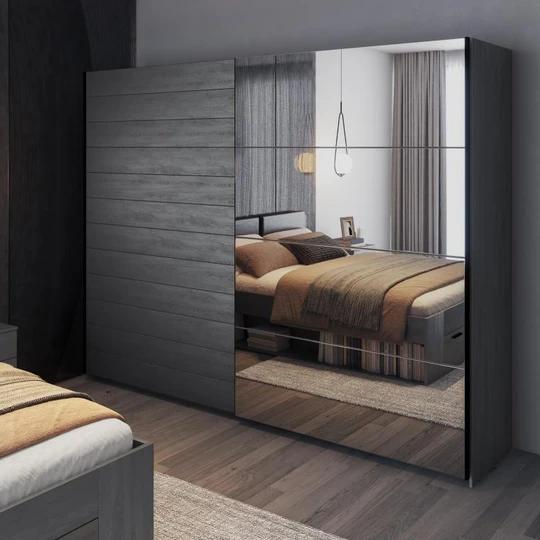 Součástí šatní skříně jsou dvoje posuvné dveře, které ušetří každý centimetr čtvereční v pokoji. Je tedy ideálním řešením i pro menší místnosti. Jedna strana dveří je vybavena plnohodnotným zrcadlem, které nejenže dodává nábytku kouzlo, ale také Vám pomůže s vychytáváním posledních detailů při oblékání.