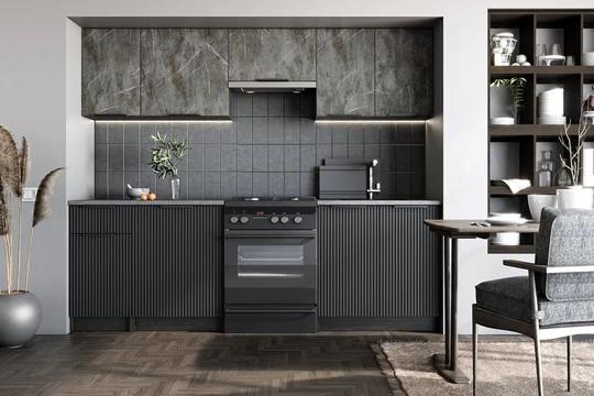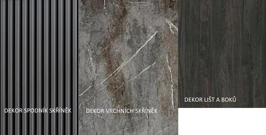 Moderní kuchyňská sestava se skládá z horních skříněk v barvě šedého mramoru a spodních skříněk v černé barvě s designovými drážkami. Pracovní deska (tloušťka 28mm) v šedém dekoru harmonicky doplňuje celkový dojem kuchyně.