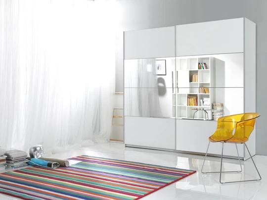 Šatní škříň o šířce 200 cm nabízí šatní tyč a 5 velkých polic.