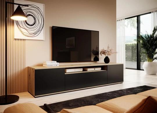 Moderní TV komoda WADE pod televizi v dekoru dub artisan/černý.