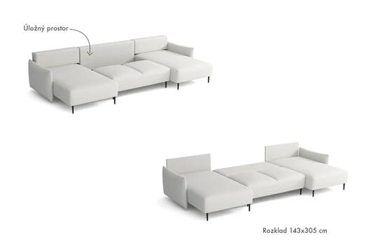 Díky 16cm vysokým nožkám vypadá sedačka mimořádně lehce a moderně. Sedačce nechybí úložný prostor a rozkládací funkce, která nabízí rozměr spací plochy 305x143 cm.