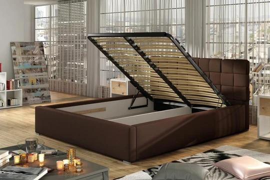 Postel je dostupná ve čtyřech rozměrech spací plochy podle toho, jaká vám nejlépe vyhovuje. Její součástí je kovový rošt s pístovým mechanismem, pod kterým se nachází úložný prostor.