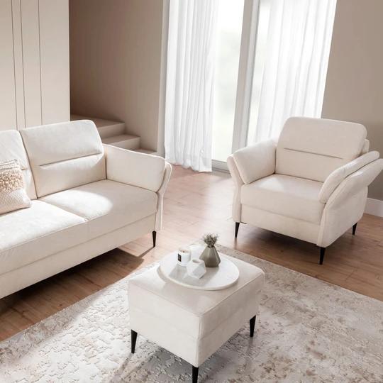 Sedák je středně měkký, vyplněný vysoce kvalitní T-pěnou o hustotě 30kg/m3 a pružinami (faliste a bonell). Stabilitu a odolnost zajišťuje kombinovaná dřevěná konstrukce s vysokými kovovými nožkami, které můžete přizpůsobit vašemu interiéru výběrem ze tří barevných variant: zlatá, černá nebo chromová.