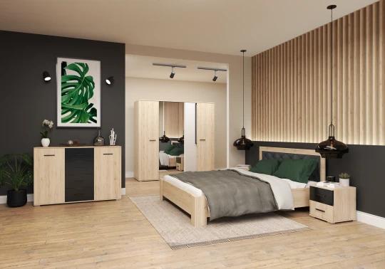 Manželská postel Libera je skvělou volbou pro všechny, kteří hledají moderní design, pohodlí a spolehlivou kvalitu pro každodenní spánek. Elegantní kombinace dekoru světlého dřeva San Remo s kontrastním černým čalouněným čelem dodává posteli stylový vzhled, který snadno zapadne do současných interiérů.